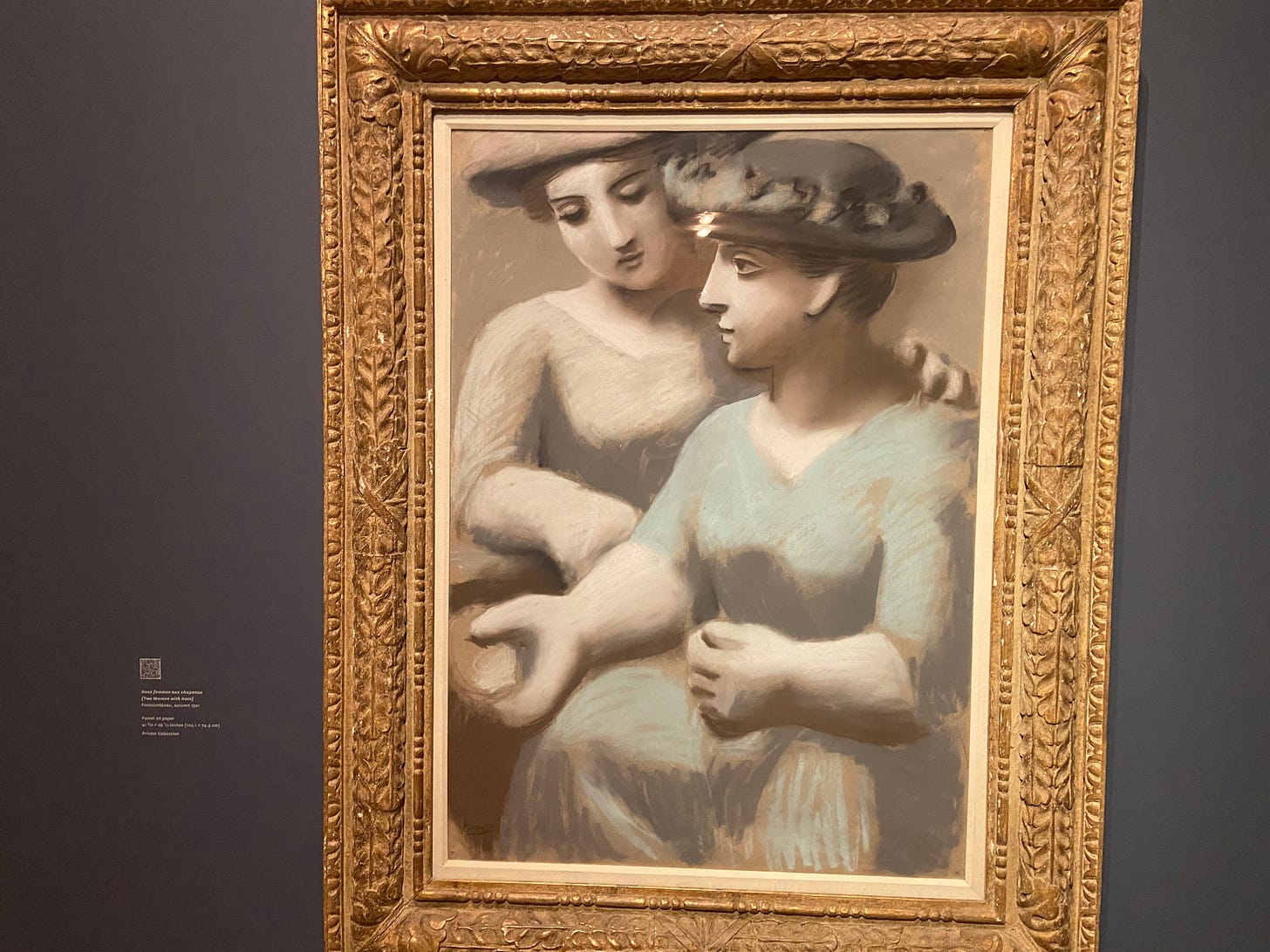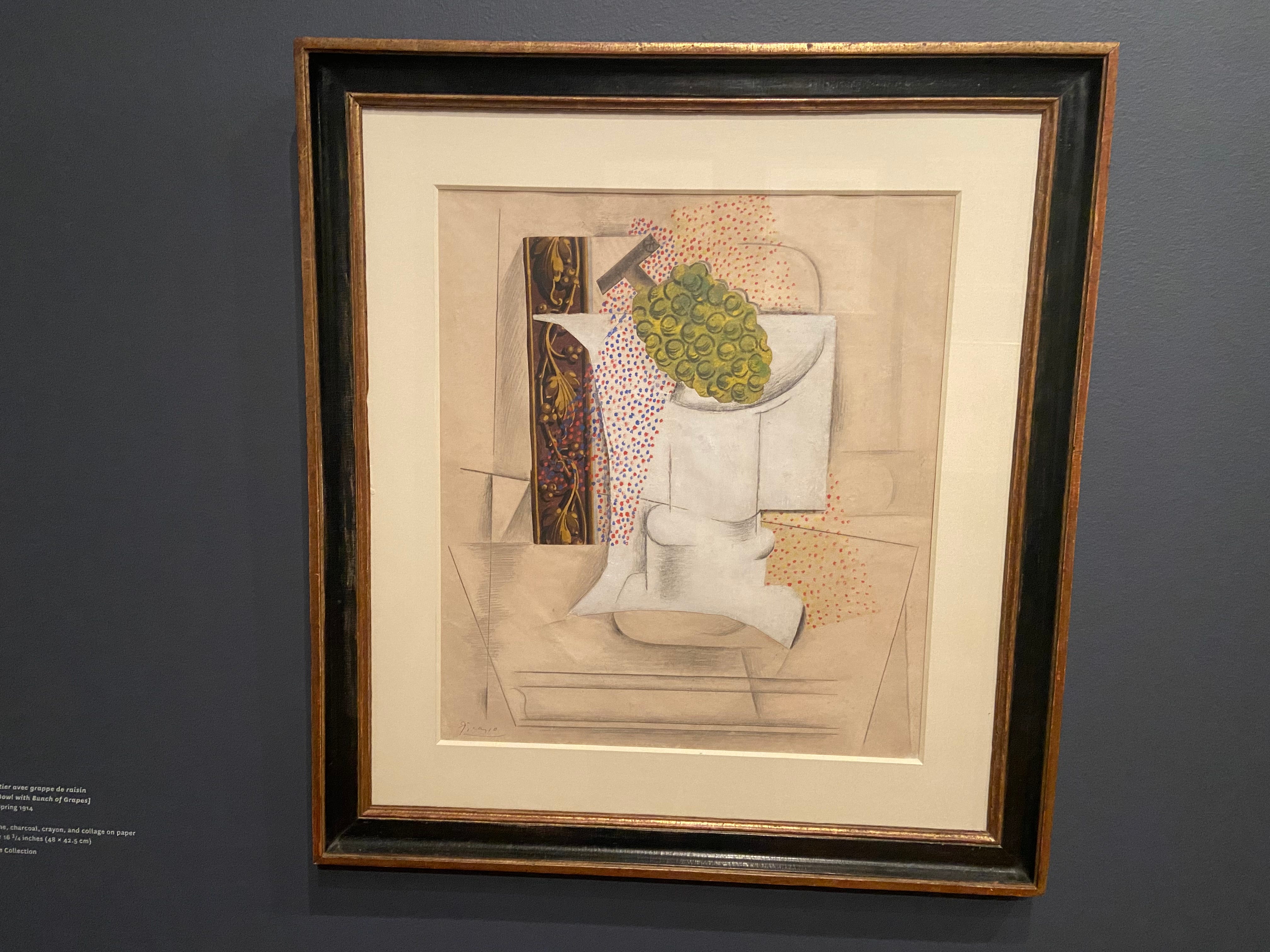 There are two collages in the show, both of which line up with the era of synthetic cubism (c. 1912 - 1914). Neither is major but Compotier avec grappe de raisin [Fruit Bowl with Bunch of Grapes] (1914) is easier to sink into. It features a vase, bifurcated to show its different angles. He’s “obtaining sculptural results by strictly nonsculptural means” (Greenberg) and atop the vase—not neatly inside but almost floating above—is a cut-out of grapes. At the time, Picasso had folders of pre-drawn pipes, cut pears, etc, that he could use as a readymade and insert into his work. The lighting is, as Picasso expert Christine Poggi points out, a parody of pointillism with deliberate misuse of the form.