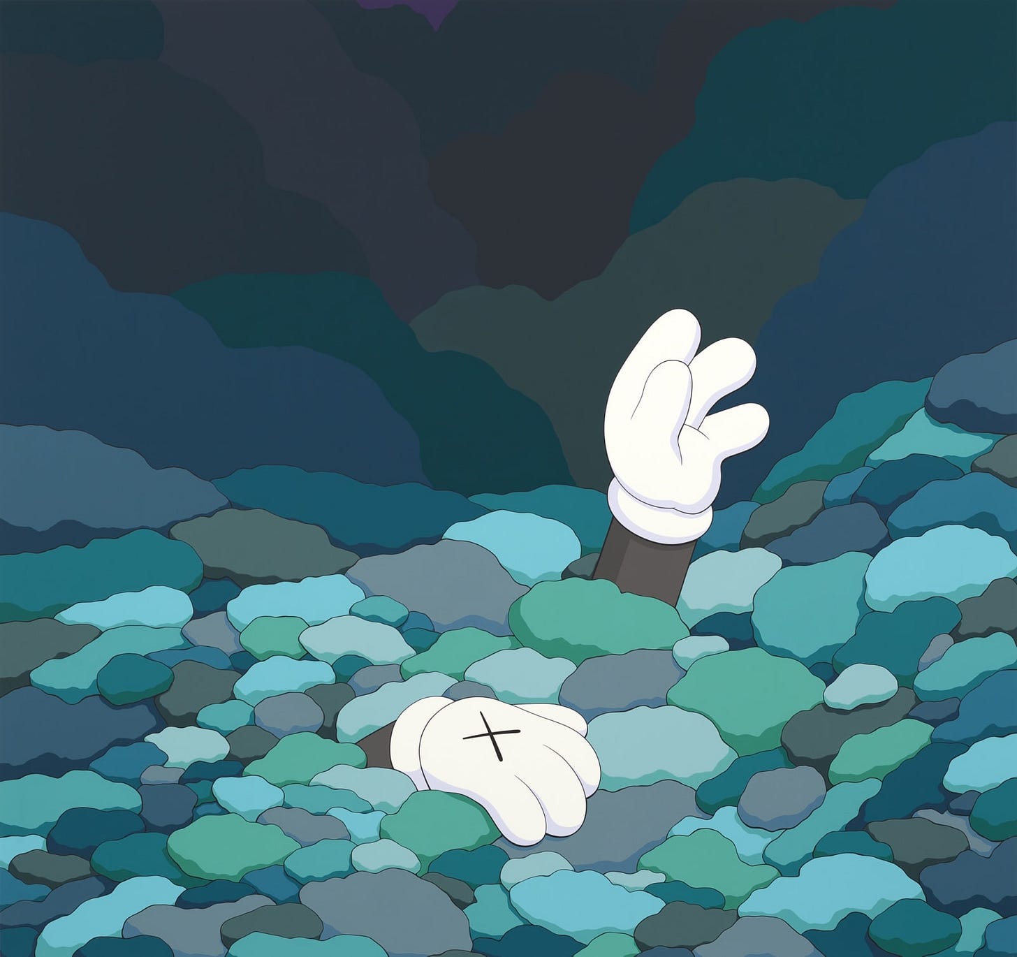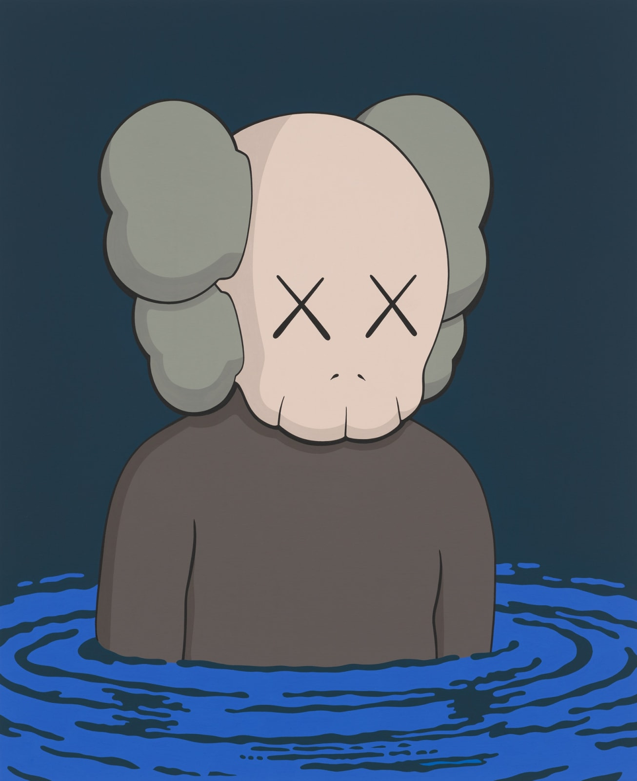 It somehow feels like punching down when he seems to be in such a bereft headspace, but the works do little more than indebt me with a sense of sadness. That is something, though. They are effective in that manner and that’s not to be discounted. However, the actual art itself looks like it was created by an AI that knows KAWS’ standard fare. Take for instance STILL HERE. In the center of the painting is Companion. The background is a flat, dark navy blue. The figure in the foreground is a body of water of some kind. He is enmeshed by a swirling whirlpool. The whole thing can be glimpsed in a split second. Spending more time with it doesn’t add to its cause. There doesn’t appear to be a human touch. It feels dead.