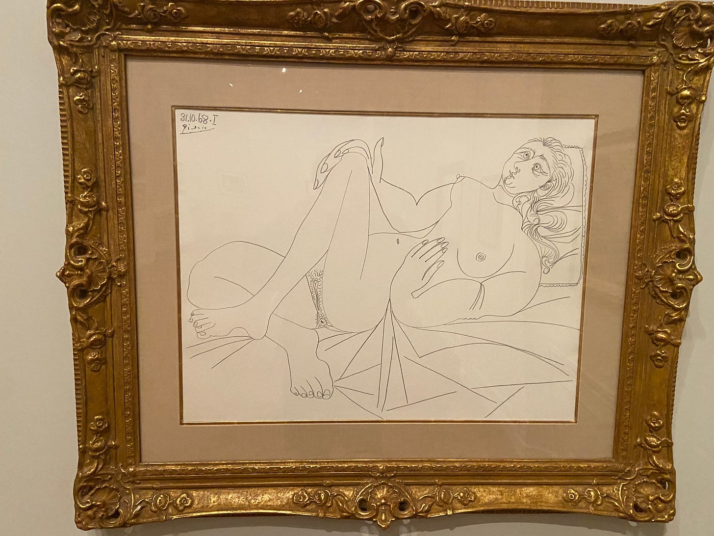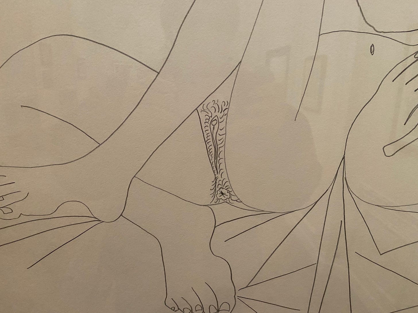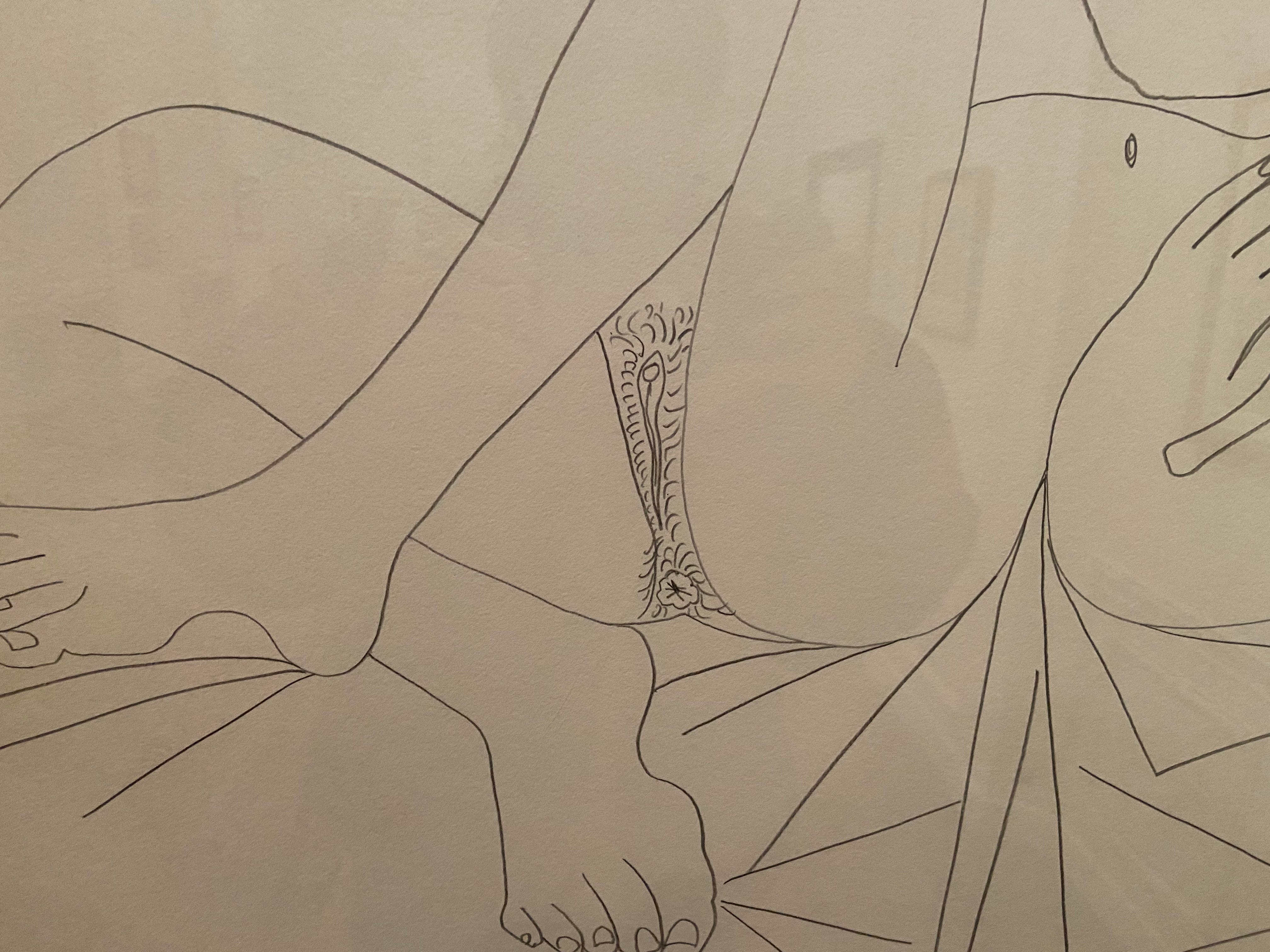 The woman was drawn from memory—apparently, Picasso had a great memory. The lines are elongated and the features exaggerated. The woman is lying on an unmade bed, which has an almost cubist arrangement. Her hair cascades onto a pillow that is almost floating. Her asshole is a main feature that looks like a flower with an asterisk in the middle. No doubt, the old man got a kick out of this one.