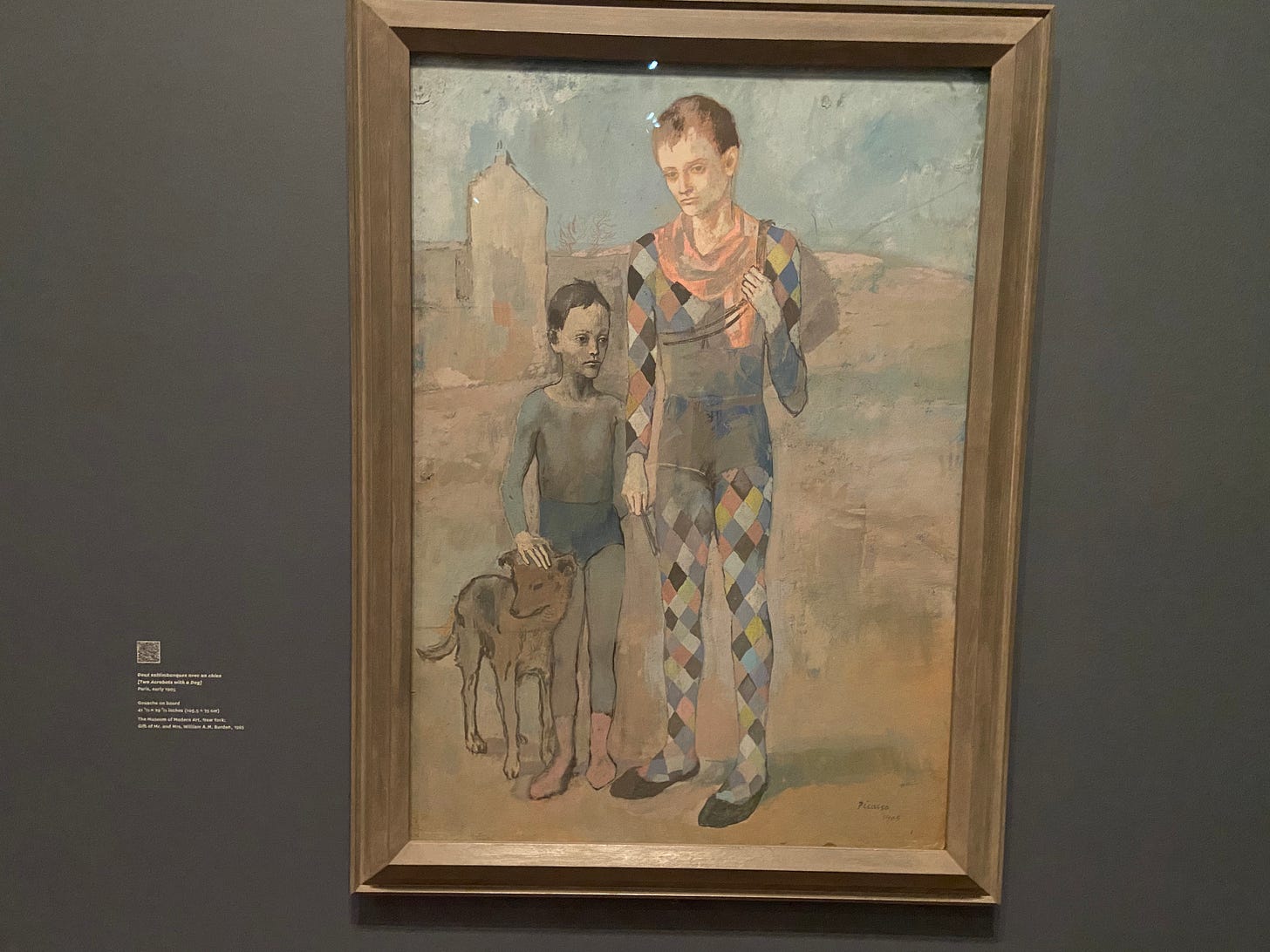 So when you look at something like the gouache, Deux saltimbanques avec un chien [Two Acrobats with a Dog] (1905), it doesn’t bow down to the National Gallery’s Family of Slatimbanques (1905), which features the same subject matter, because it is its very own entity. At the time, Picasso lived near the Paris circus and he was always fascinated by the downtrodden, by musicians, actors, and jokers. Painted during his Rose Period, the gouache is, like the KAWS works, sad. But the sadness isn’t gaudy here; it isn’t trying to knock you on your head. It’s subtle. The main figure, a boy, possibly a teenager, has one hand affixed to a strap of the sack he is holding, and his other hangs low as if it contains a great weight. His eyes evade ours. He and the younger boy both look away, as if to meet us would be to disrespect us. They also look away from each other and the dog the shorter boy is petting looks off into the distance, past the confines of the work. The sky is cloudless but it isn’t bright and there is no sun. It’s meditative and serene; controlled, cold, and empty.