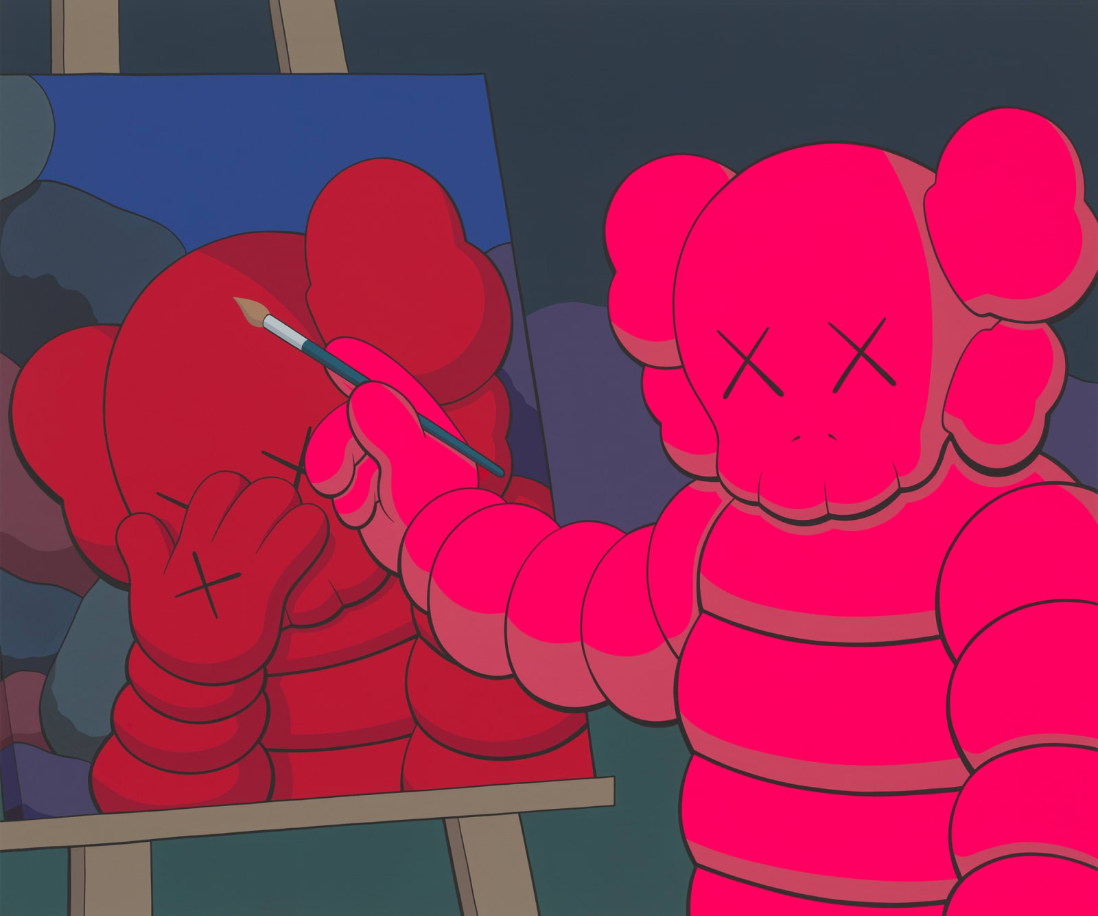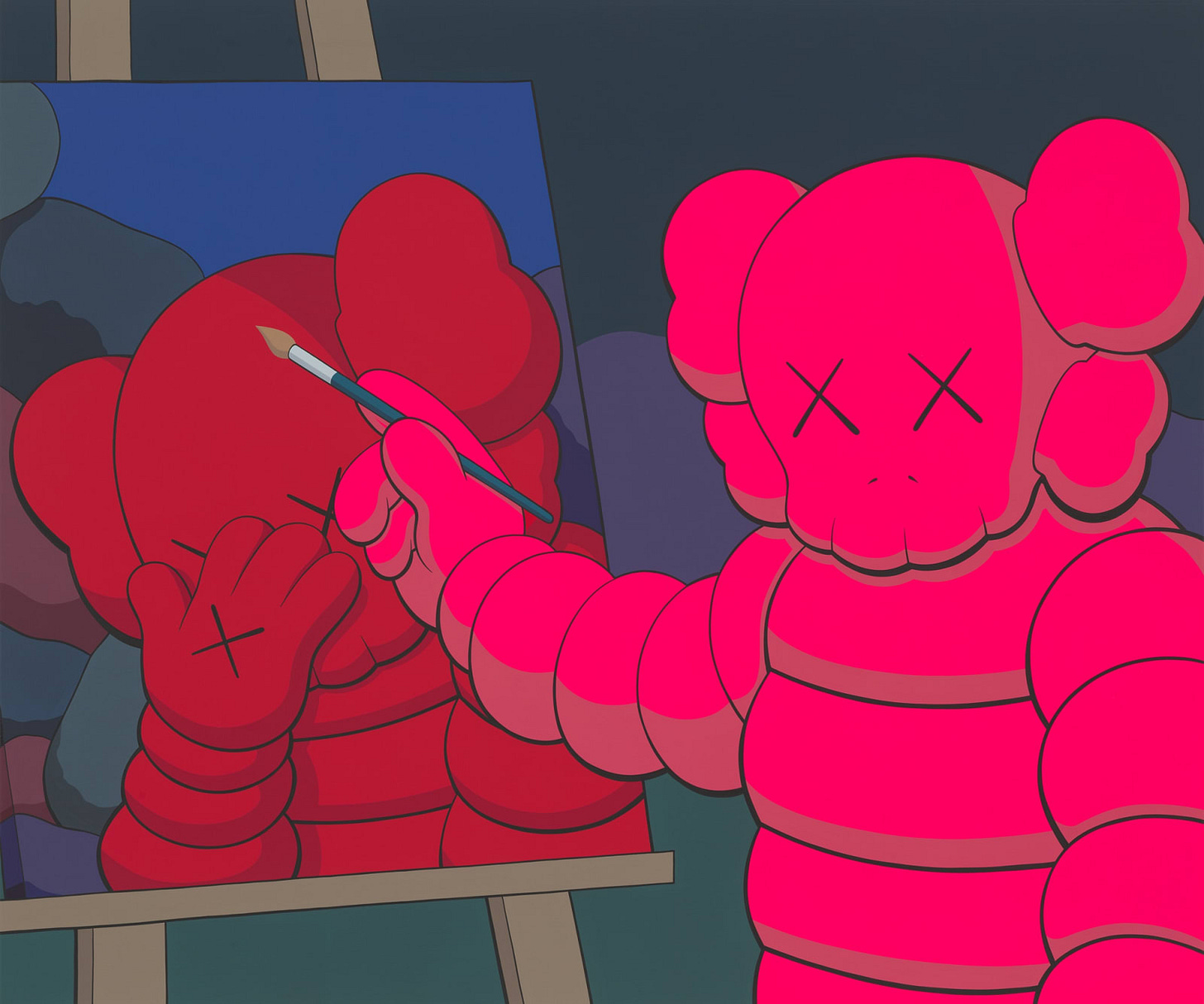 Walking around Skarstedt, I was mostly amused. Amused when the security guard yelled at the 17-year-old kid who rubbed his hands across an all-black sculpture of Companion who is holding a limp Elmo doll. “You really have to be told not to touch a million-dollar work?” the guard asked. Then, I chuckled to myself when a guide attempted to draw a throughline between Rembrandt’s self-portraits and a KAWS painting titled THE PAINTER (2021). In it a pink Chum stands in front of an easel, paintbrush in hand, the tip aligned with a self-portrait of a red Companion, head bowed in sadness, hand meeting it as if to hide the shame.